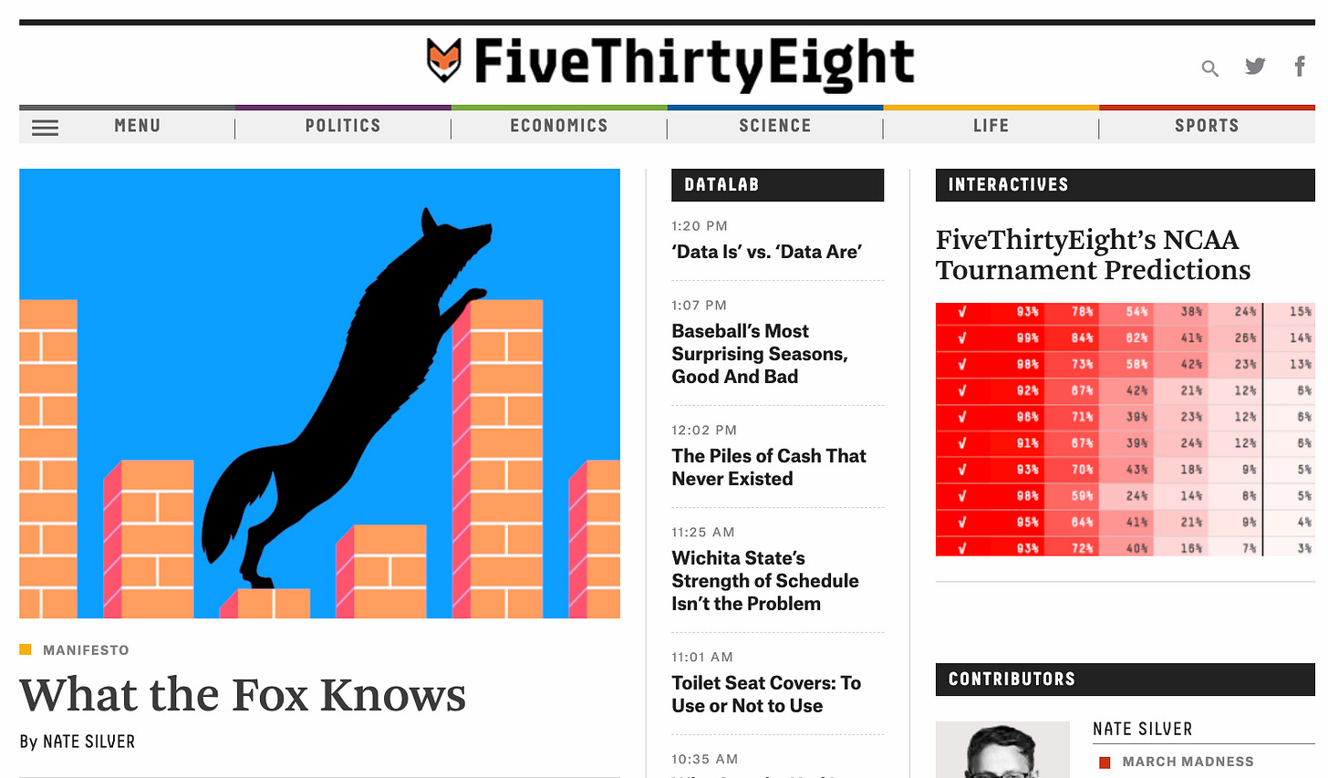 FiveThirtyEight was the original brand name; more recently, Disney began stylizing it as “538”. I’ve alternated between these usages here based on the era I’m writing about.