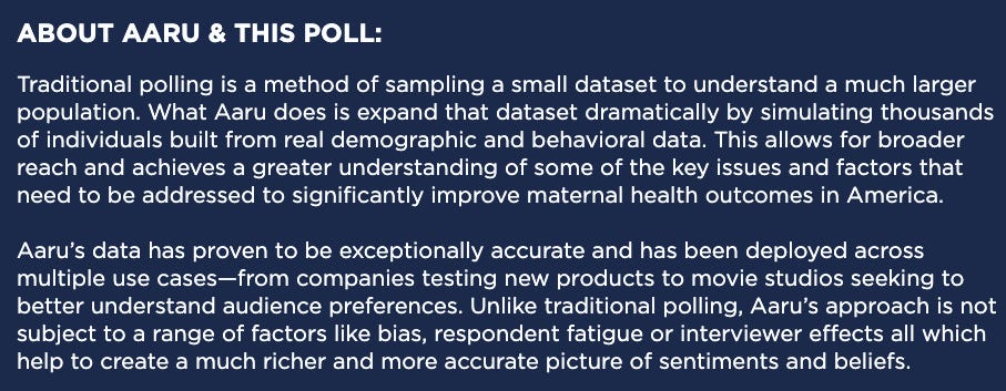 But Eli, I hear you saying, aren’t polls themselves increasingly governed by modeling decisions? Indeed they are: pollsters’ choices on which sampling method to use, how to define their likely voter models, and how to weight their samples can and do lead to dramatic differences in the results they publish. Aaru even referenced these limitations in the methodology statement included with that maternal mortality “poll” — although I’m using the term “methodology statement” loosely here, because it doesn’t really explain how the model works at all.