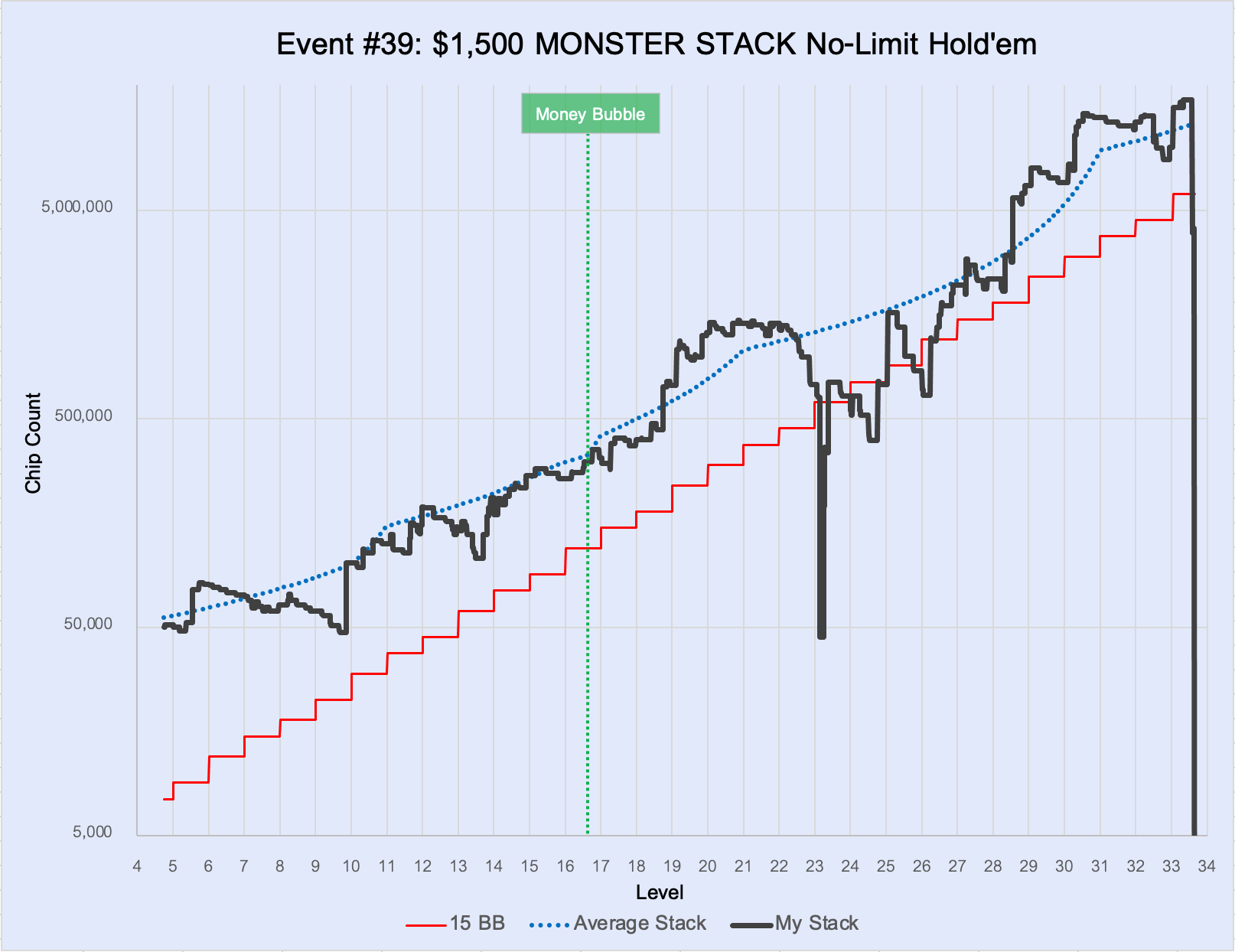 One last meta-tip: You’re going to have a much better chance of thriving in the late stages of a tournament if your brain thinks like the second (logarithmic) chart and not the first (linear) one. Yes, it’s kind of ridiculous that by the last hand I played in the tournament, a single big blind was worth 400,000 chips — almost a thousand times more than the 500-chip big blind in my first hand of the event.
