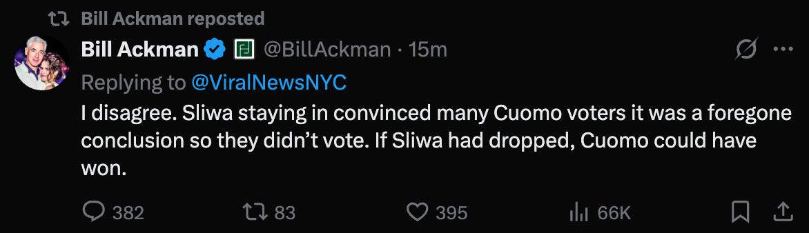 Meanwhile, Cuomo backers like Bill Ackman have accused Sliwa without evidence of just being in the race for the money. (Sliwa, also without evidence, has accused Cuomo backers of trying to bribe him out of the race.) This projects an incredible sense of entitlement for Cuomo, a candidate who had the chance to beat Mamdani fair and square in the Democratic primary, but actually lost further ground once ranked-choice ballots were tallied because Cuomo was so polarizing.