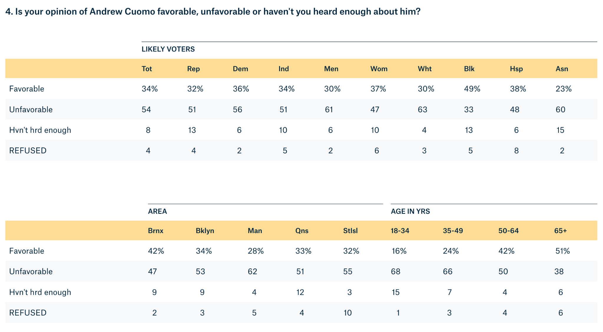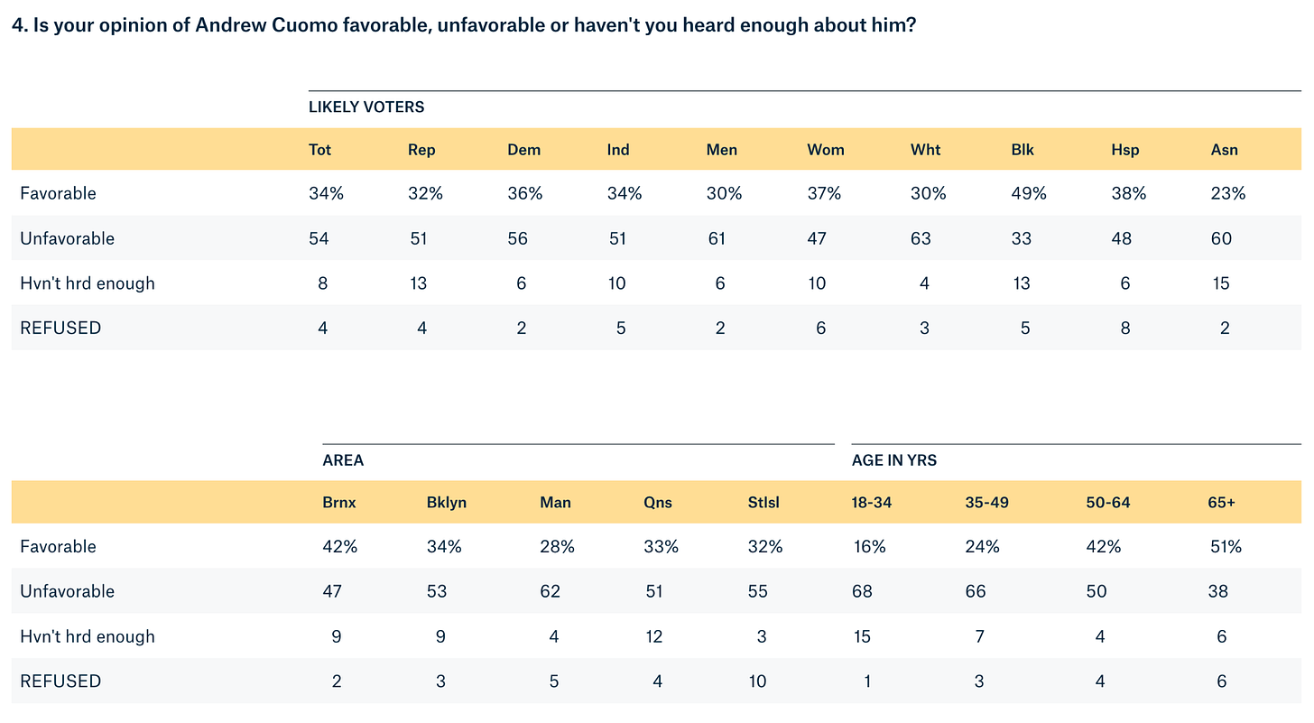 Cuomo simply doesn’t have any foundation of people voting for him for positive reasons. In last week’s Quinnipiac survey, for instance, which actually showed a slightly closer race than most, the only demographic group to give Cuomo a favorable rating above 50 percent was voters aged 65 and older, and then just barely at 51 percent (against 38 percent unfavorable).