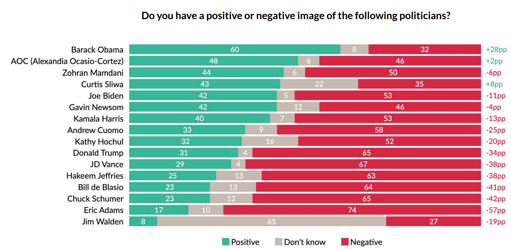 New York City voters really dislike everybody, except for Barack Obama, AOC and — improbably because he has a negative rating in most other polls — the Republican nominee Curtis Sliwa. The past two mayors, Eric Adams and Bill de Blasio, are deeply unpopular in this survey. So are congressional leaders Chuck Schumer and Hakeem Jeffries, Governor Kathy Hochul, and to a lesser extent, Joe Biden and Kamala Harris. Any and all Republican figures apart from Sliwa are also unpopular in New York, of course, which is why Mamdani probably doesn’t mind President Trump’s endorsement of Cuomo.
