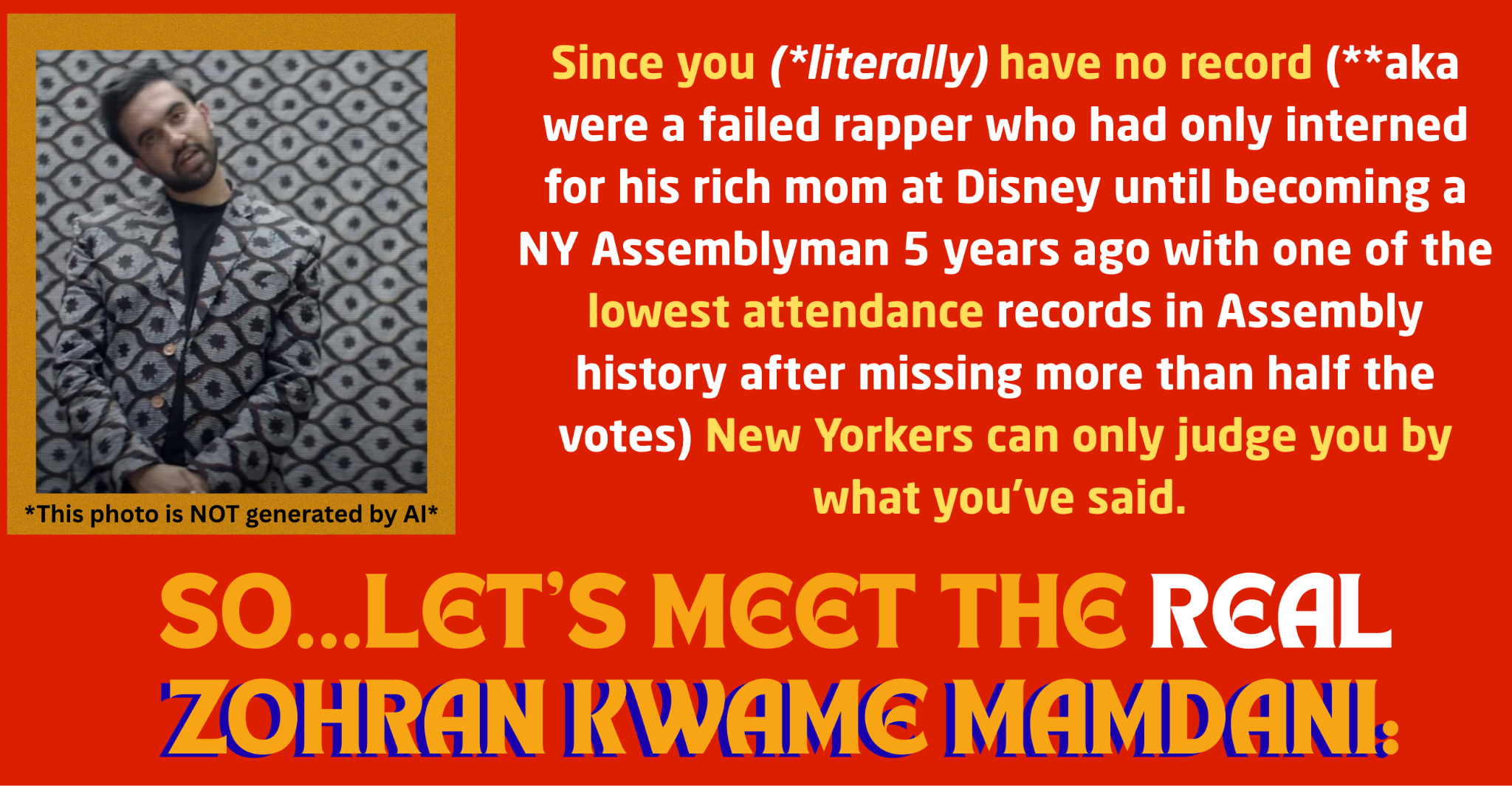 But the messaging from Cuomo is dripping with content — like “failed rapper”, “rich mom”, or a bizarre AI-produced video in which Fake Zohran slurredly sings “I’m just a shill” in what I’m not even sure you can call a Schoolhouse Rock! parody because parodies are supposed to be funny.