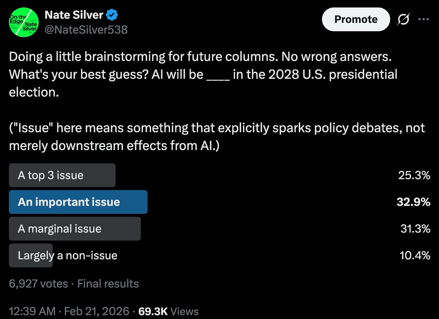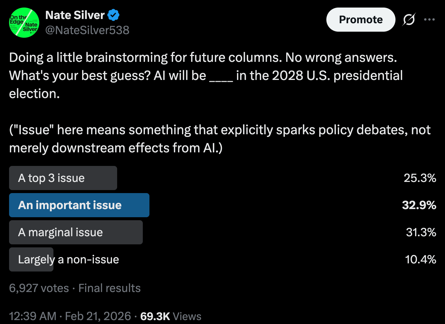 February 2026 is likely to be remembered by historians as the inflection point when we moved into some sort of accelerated timeline on AI-related developments. Not necessarily with respect to the technology itself (although see bullet #3 below); I remain fairly skeptical of the hyper-turbocharged timelines toward superintelligence envisioned by the AI 2027 report, for example. But the point at which AI became a major storyline — maybe the major storyline — in politics and economics, too big even for the skeptics to ignore. The 42 percent of people who said that AI will only be "a marginal issue” or “a non-issue” in the 2028 election in this Twitter poll a week ago are probably going to be wrong.