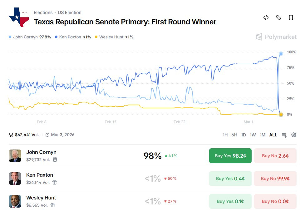 However, the conventional wisdom has been rattled because this is one of those cases where, along with the prediction markets, it got ahead of itself in the first round. At Polymarket, Cornyn had fallen to as low as 5 percent to win the first round as of 10 a.m. Tuesday morning; those chances are now 98 percent.