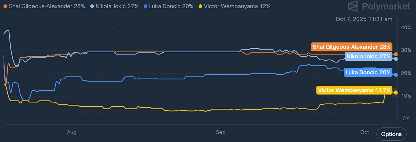 But for what it’s worth, prediction markets are warming up on Victor’s chances for an MVP this season. While I think 11.7 percent is an okay bet — Polymarket had it at 4.4 percent when I originally wrote this, which would have provided a much better value — that figure is skewed by the constraints of the MVP award as a whole. It’s more likely the Spurs miss the playoffs than make the Finals next season — but how much of that is a reflection on his talent rather than the weird limbo the Spurs are in?