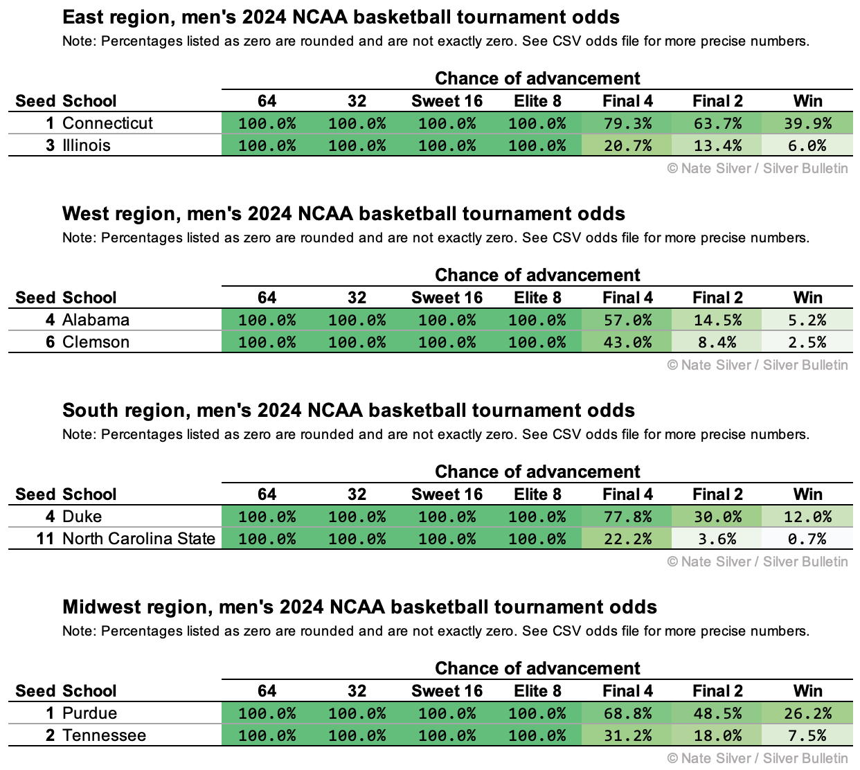 I was a little bit on the fence about whether to post this here at Silver Bulletin, but I got a request for an Elite Eight update from an important subscriber (my mom) so here goes. Numbers are updated with Friday night’s results plus the latest injury news. Tennessee’s Santiago Vescovi and Alabama’s Latrell Wrightsell Jr. are questionable for the Elite Eight, so those are the main situations to monitor.