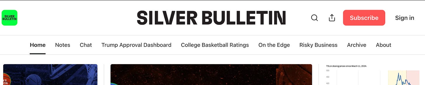 In some ways, the essays are my pride and joy. They’re the fancy restaurant. But the long-term plan was never for Silver Bulletin to be “just” a newsletter but rather a bundle of essays and models. And now we’re starting to accomplish that. If Phase I of Silver Bulletin was the pre-election period and Phase II was the election peak, we’re now in Phase III, where we have some of both.