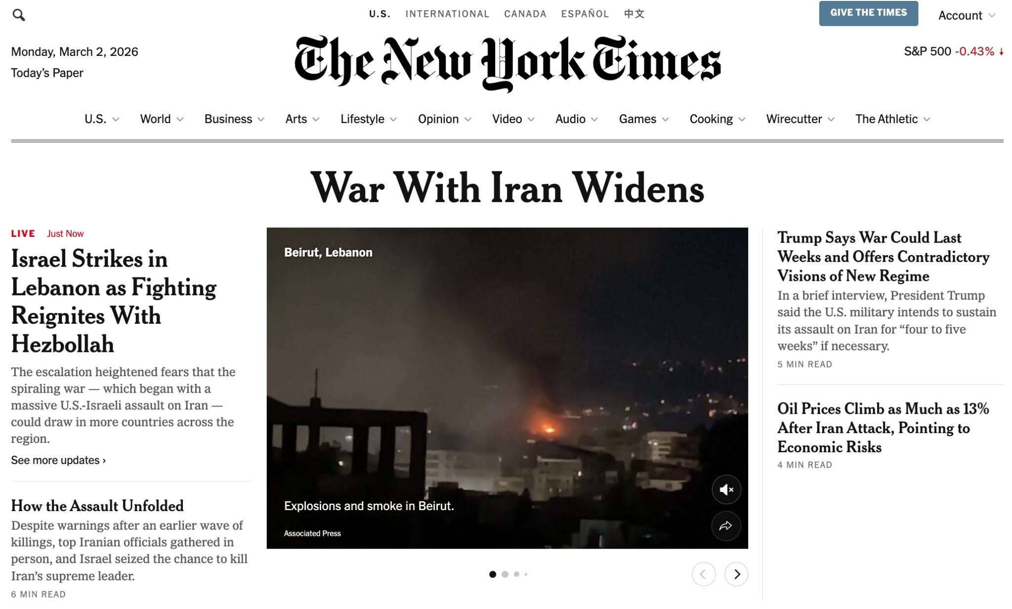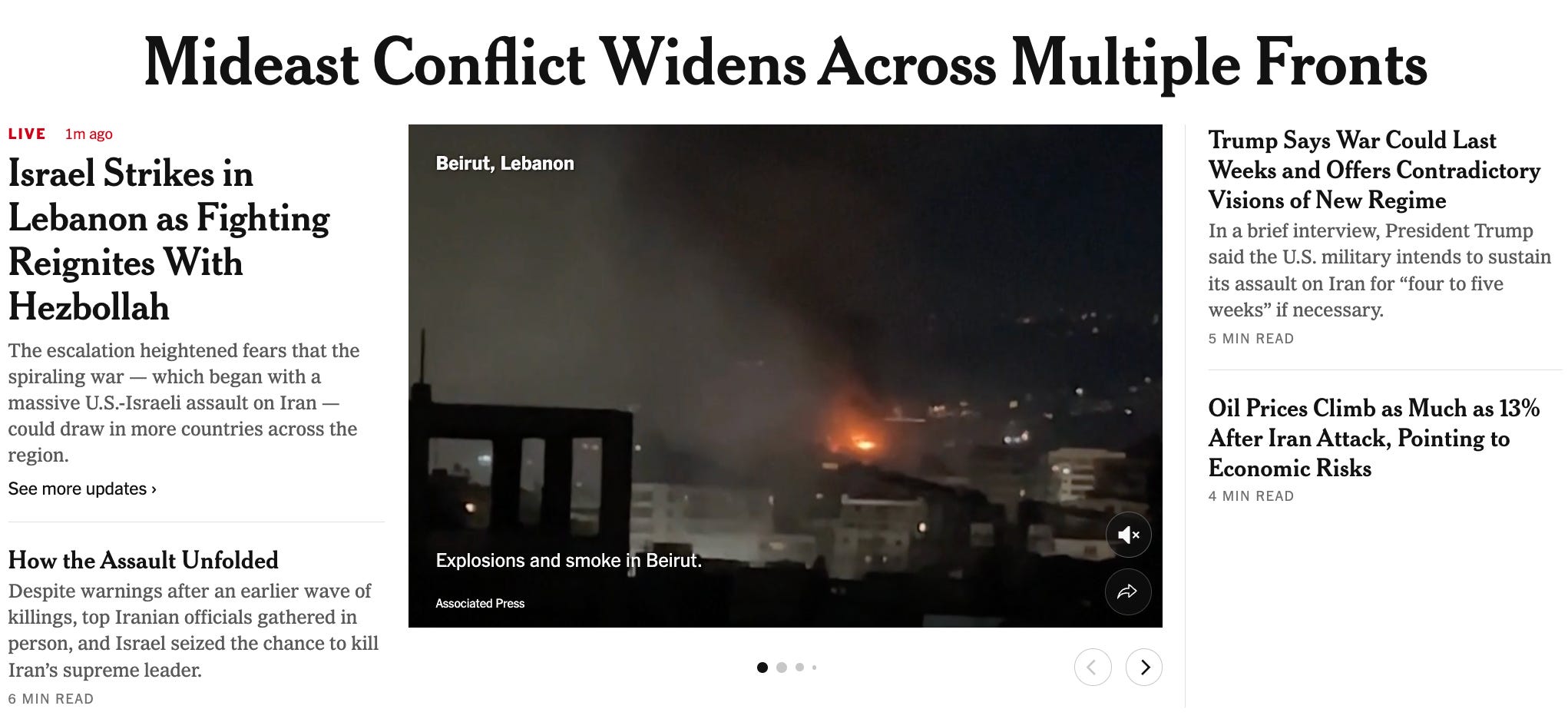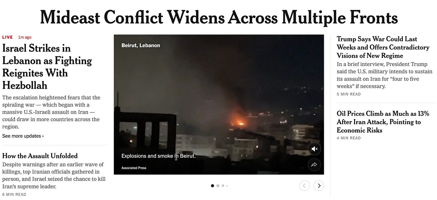 Just a few minutes after I started writing, however, the Times’s headline changed to “Mideast Conflict Widens Across Multiple Fronts”: