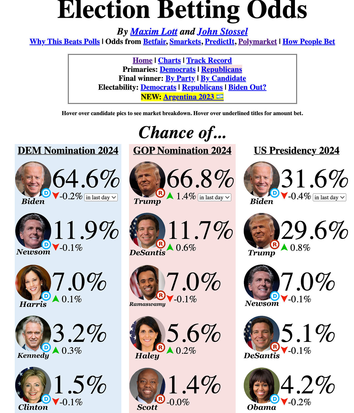 Assuming that Biden and Trump’s odds are independent from one another1, that means the chance of a rematch is only 65% x 67% = 44%. That’s right. Bettors at prediction markets think that a rematch probably won’t happen.