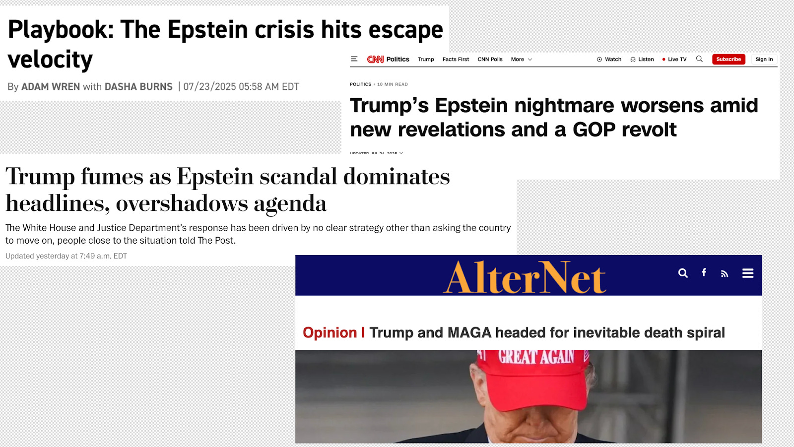 On July 7, the Justice Department claimed that Epstein did not have a “client list” and said it didn’t expect to release any more files about his case to the public, contradicting implied promises by Attorney General Pam Bondi and Trump himself to provide more disclosure. In the three weeks since then, this has been overwhelmingly the lead political story, often framed around headlines like these. It’s a “nightmare” for Trump that’s hit “escape velocity” or could even lead to a “death spiral.” At the very least, it’s overshadowing the rest of his agenda.