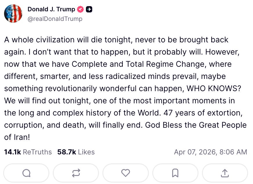 And then on Tuesday morning, Trump doubled down, claiming that “a whole civilization will die tonight” if Iran didn’t make some effort to reopen the Strait of Hormuz by 8 p.m. last night: