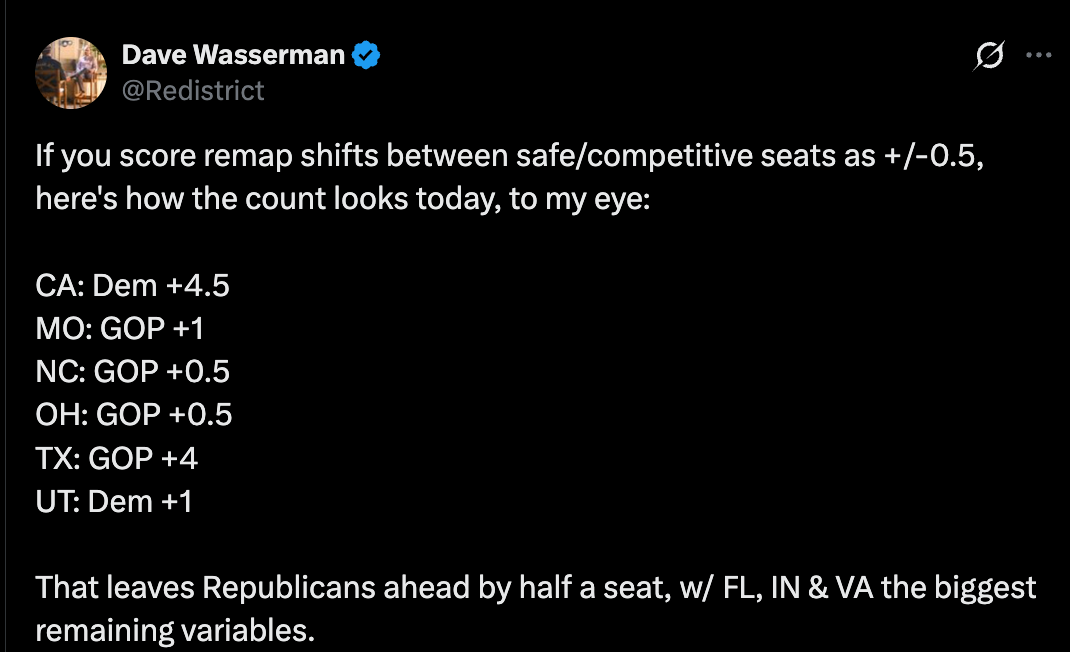 Indeed, the parties are not taking a truly maximalist approach. Indiana has been one example, but also consider California. Democrats are expected to gain an additional 4-5 seats as a result of their new Gavin Newsom-backed, voter-approved map. But that will still leave 4-5 Republicans in California’s congressional delegation, when in theory it would be possible to draw a legally-compliant 52-0 Democratic map.