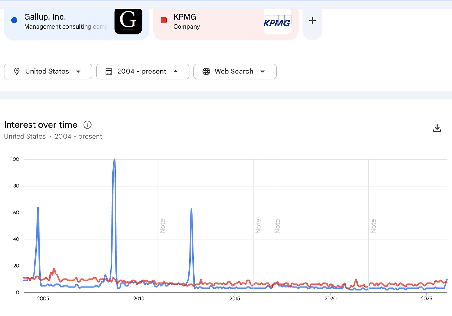 Because Gallup definitely has an outsized brand name relative to the magnitude of its business. Here, for instance, is a comparison of the volume of Google searches for Gallup and the management consulting firm I used to work for in my 20s, KPMG.