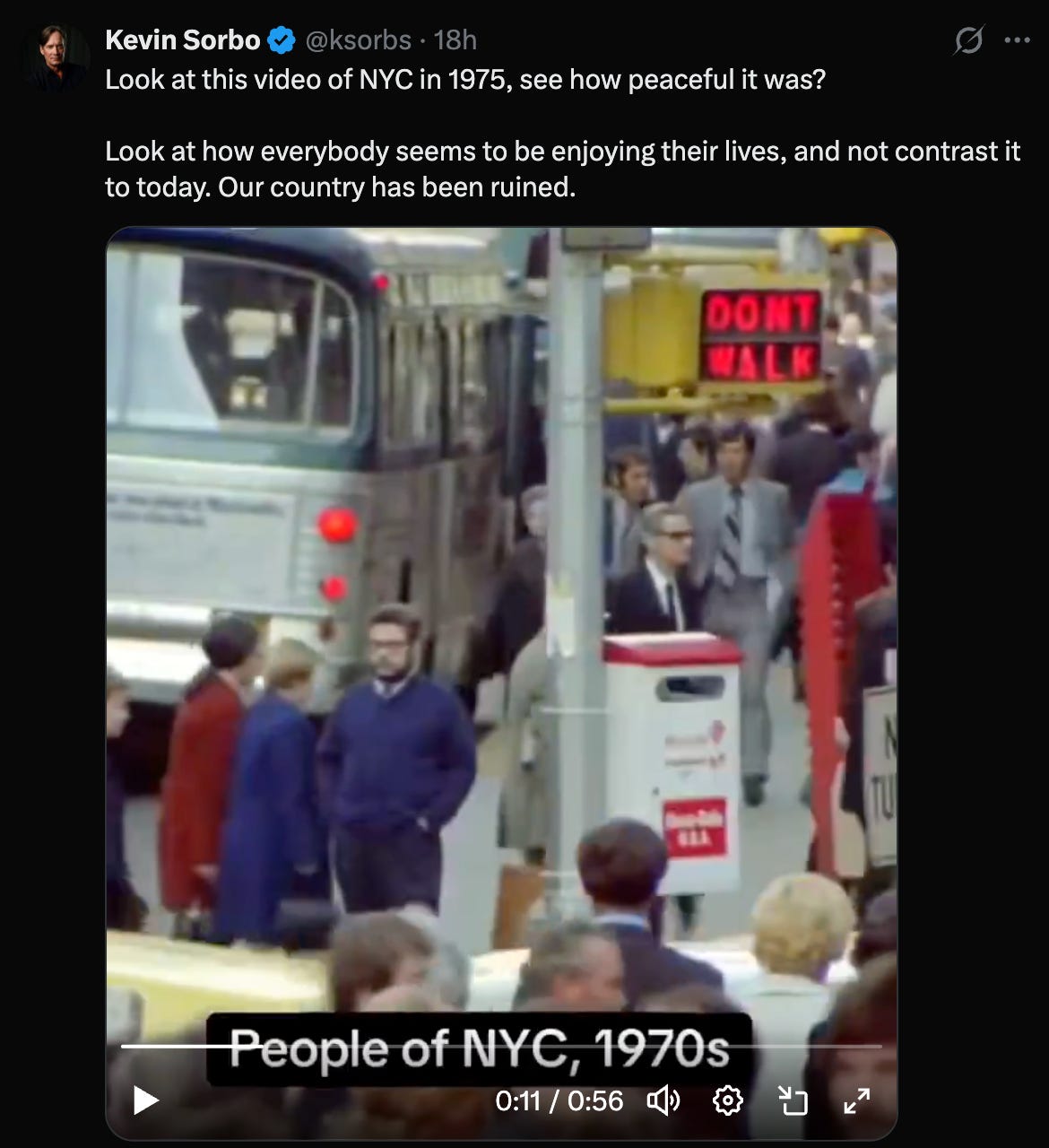 I’m admittedly a fierce defender of New York City, where I’ve lived since 2009. But anybody who knows the least thing about New York knows that 1975 was one of the lowest points in the city’s history, literally the year of “FORD TO CITY: DROP DEAD” because the city was on the brink of bankruptcy. This was the era of Taxi Driver, the Son of Sam and The Bronx is Burning, the beginning of a long period of elevated crime rates. Setting some B-roll to nostalgic music doesn’t erase that.