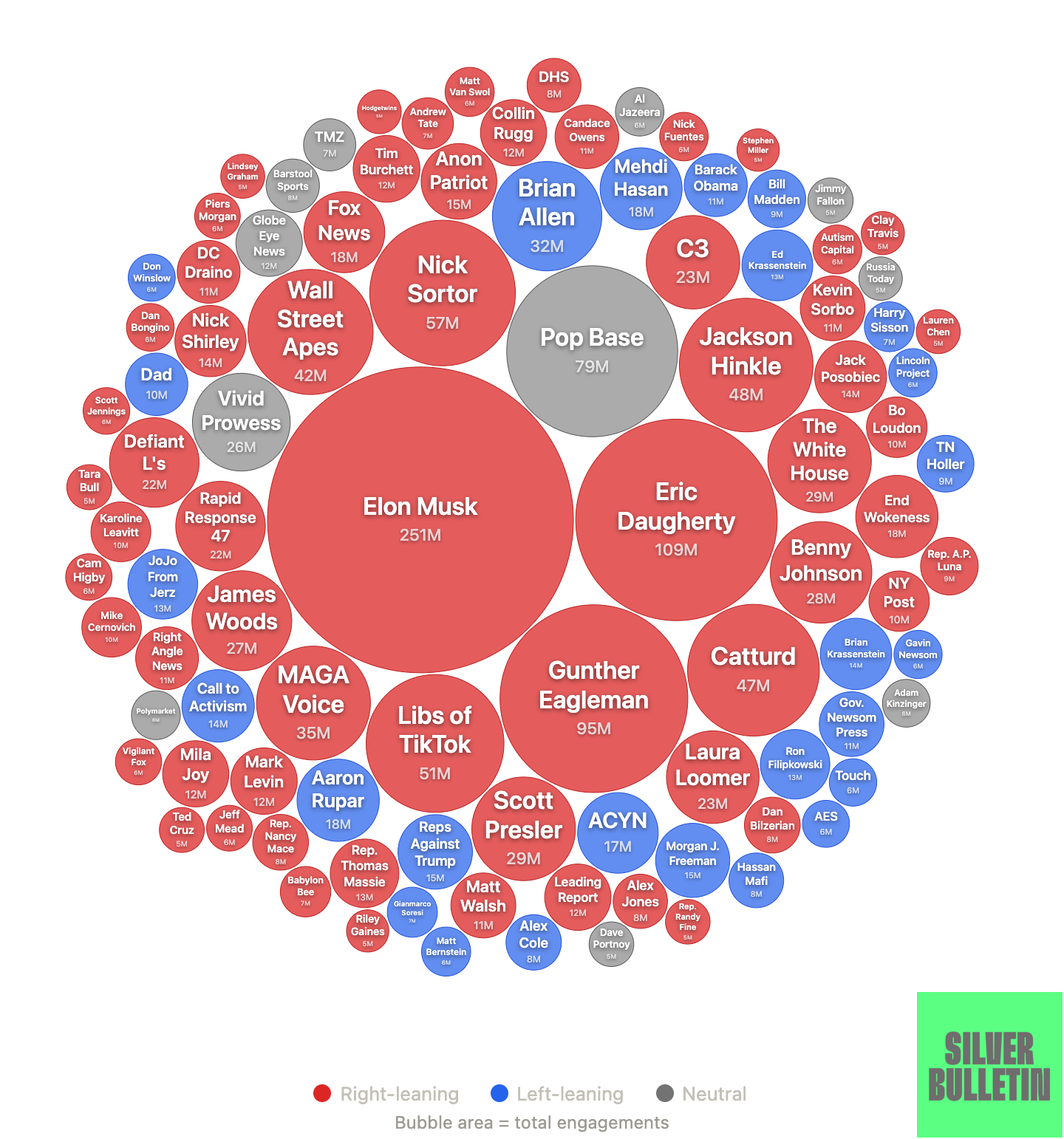 Nonetheless, today’s social media ecosystem is particularly unhealthy, I’d argue. I’ve written about Bluesky previously, and I’m not sure there’s much more to say about it: it’s small, it’s continuing to get smaller, and last month its CEO announced she was stepping down. But at least when you look at the leaderboard of top Bluesky accounts, it’s fairly predictable: mostly reasonably prominent left-progressives, though almost nobody who is going to challenge Democratic Party orthodoxy from either the center or the left. The problems with Bluesky are less about the individuals who find success on the platform and more about the high school cafeteria behavior that follows when you put them all in a small, confined space together.