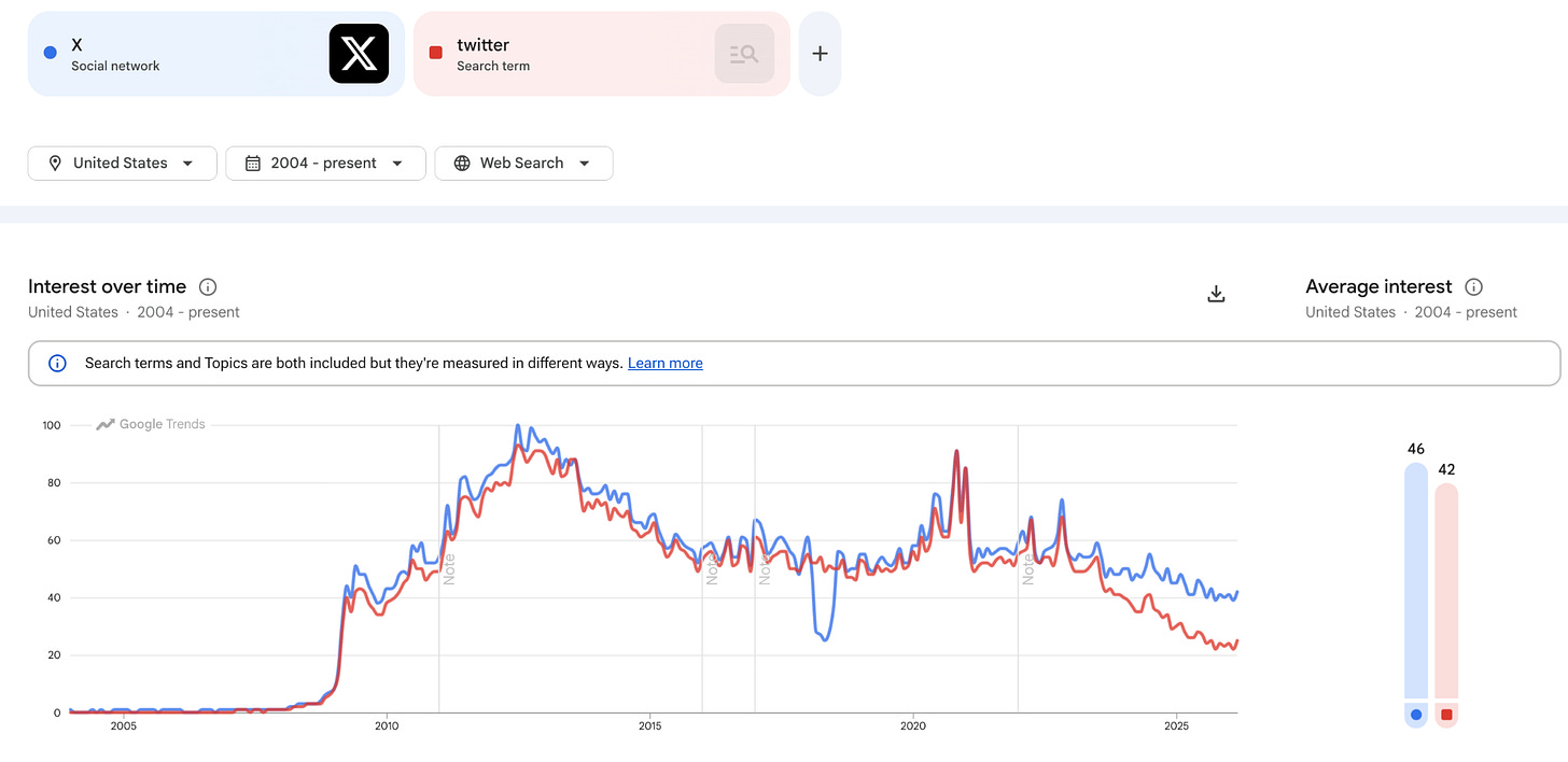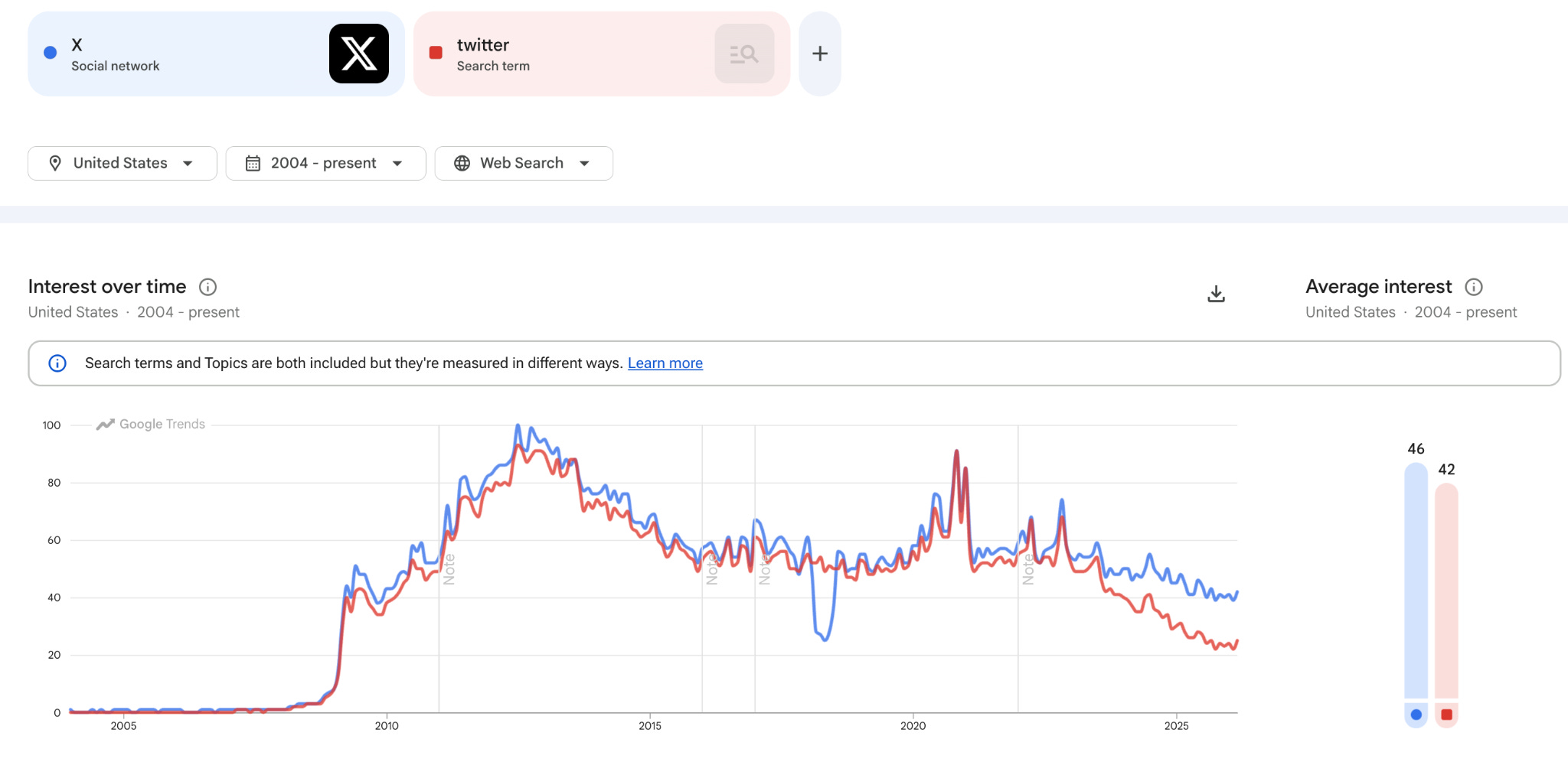 And yet, while Facebook is now almost completely irrelevant to the political discourse, that isn’t quite true for Twitter. Google search traffic in the U.S. for the precise term “twitter” is down quite a lot, but that’s not fair to X because the platform now has a new name. Broader traffic for search topics related to Twitter/X is also down, by more than half relative to the peak in late 2012. But the recent decline has been more gradual: about 20 percent as compared to two years ago. That seems to track with other third-party data showing a slow-but-steady decline in Twitter engagement, though nobody can be quite sure since X is no longer a public company.