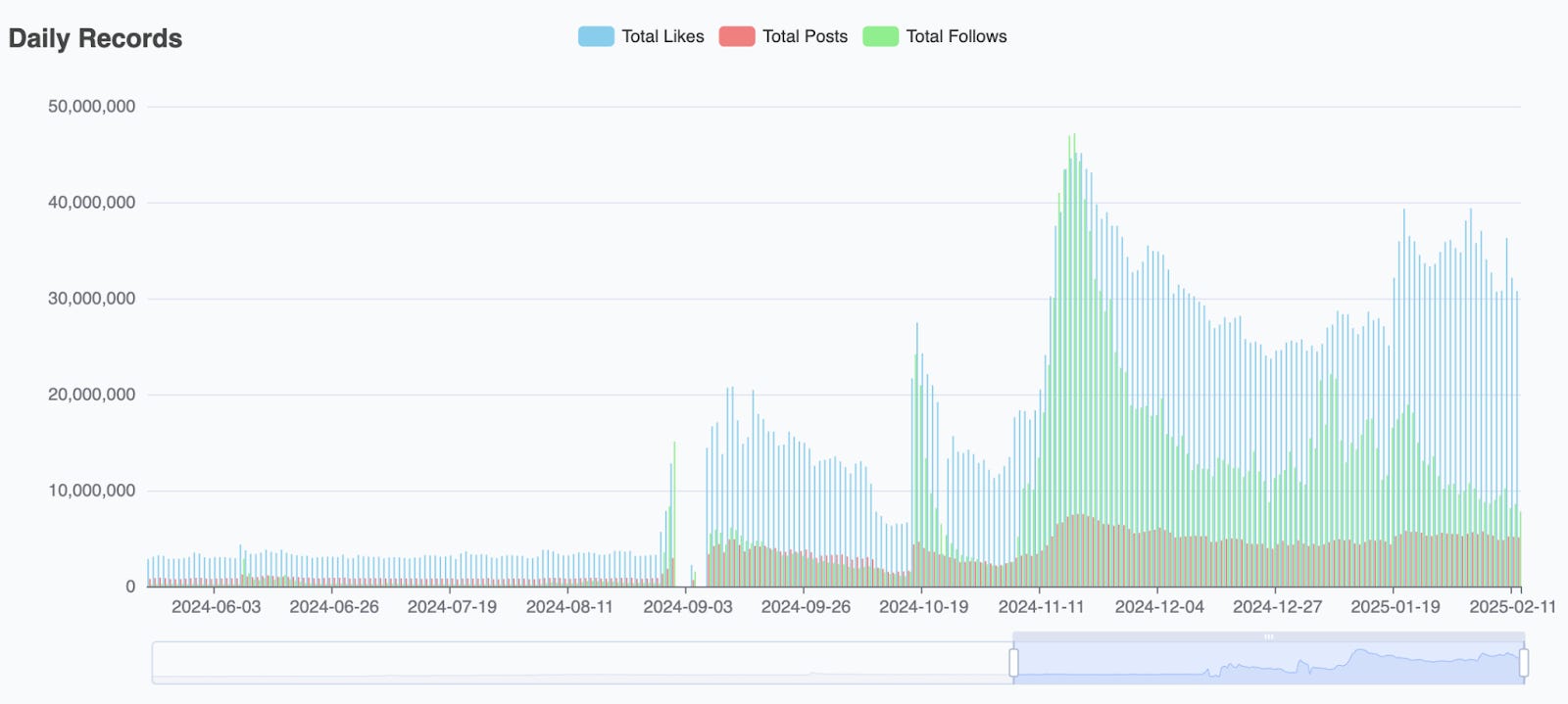 Moreover, alternatives to the platform haven’t really taken off. Meta’s X competitor, Threads, collapsed almost overnight. What about Bluesky, a spinoff originally created by former Twitter CEO Jack Dorsey? It’s found an audience on the left — but for now, it’s a relatively small one. Bluesky’s refreshing commitment to transparency leads to better publicly available data — but that data suggests its occasionally glowing media profiles are overstating its influence. Bluesky follows, likes, and posts surged after Trump’s election win but have since plateaued: