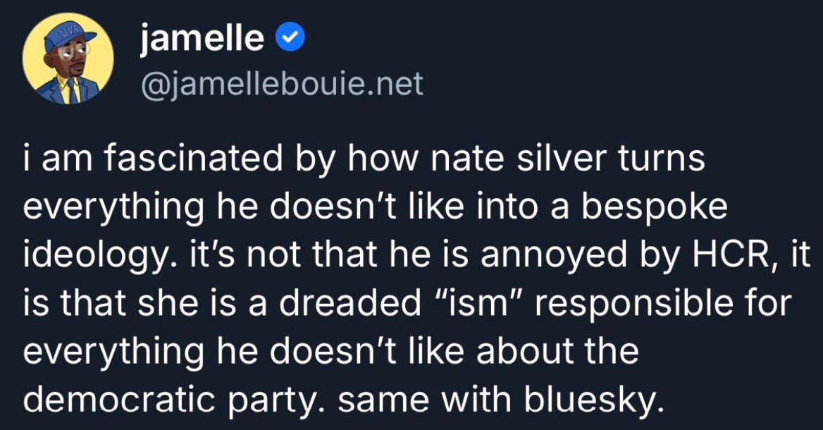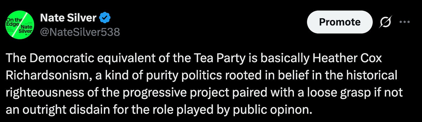 So, when people like Bouie write that “what substantively seems to annoy silver is the existence of people with principles”, they’re getting it wrong. No, what annoys me is people like Richardson or Bouie who don’t understand the is-ought distinction between the world they think ought to exist — where Biden won a commanding reelection victory and Trump is in jail — and the messy political world that we’re really living in. But who, at the same time, are not particularly principled when it comes to recognizing bad behavior on their own side. And who have other poor epistemic habits, including sometimes spreading misinformation themselves. I’d have more admiration for Richardsonism if it were either ruthlessly effective at politics or meticulously clear-eyed and consistent about its principles. It often winds up somewhere in between, squaring the circle with garden-variety Democratic Party partisanship.