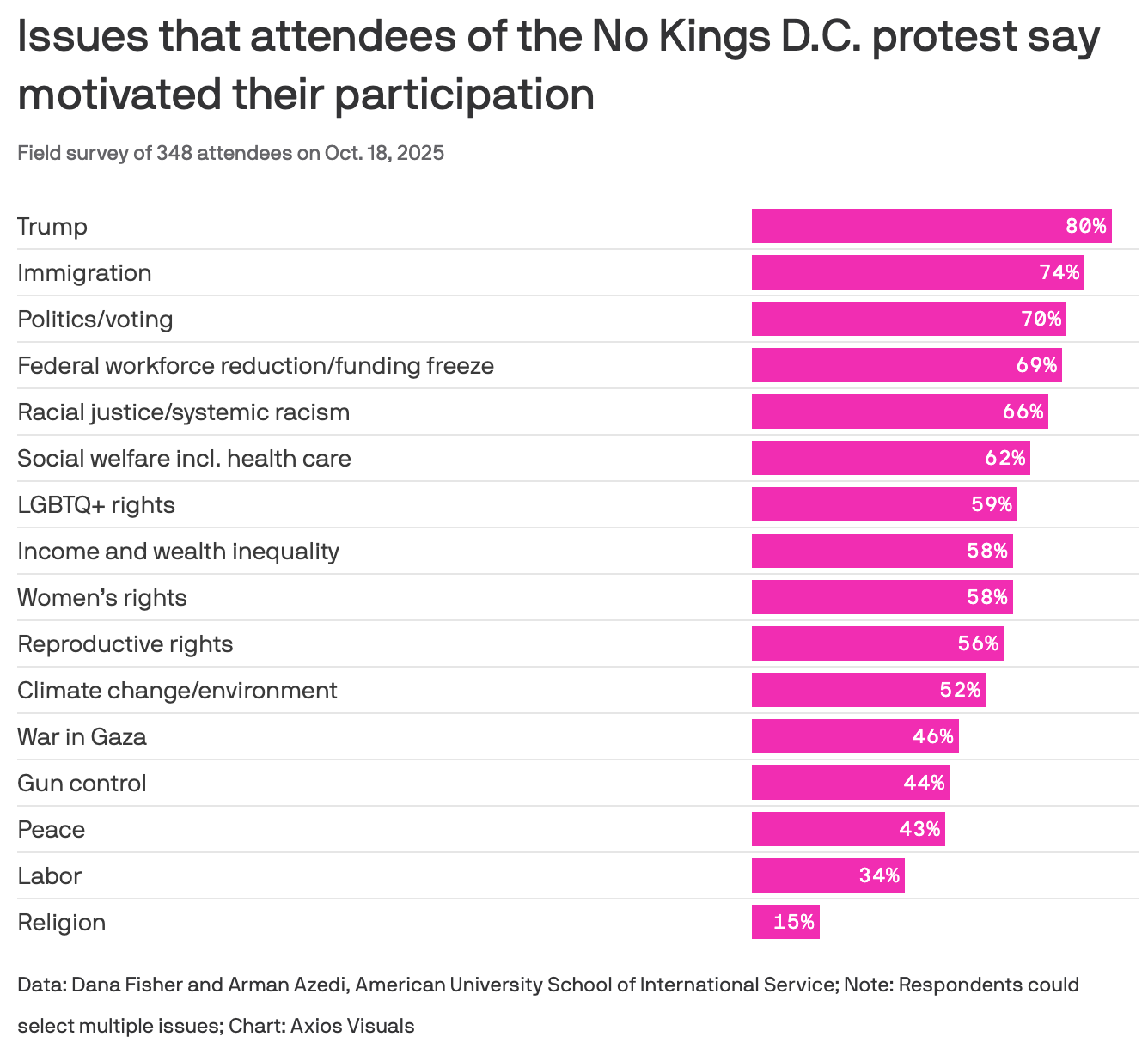 But whatever you call this faction — The #Resistance or No Kings or Richardsonism — I think one must identify it as a distinctive thing. Richardsonism often clashes with the Abundance Libs, especially on questions of “electability” and the strategic benefits (or lack thereof) of moderation. But it also doesn’t always vibe with the Capital-L Left. There’s not a lot of economic populism, for instance. Take a look at this field survey of No Kings protestors published by Axios. What were their top issues?