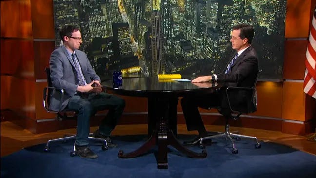 According to IMDb, I appeared on The Daily Show seven times, The Colbert Report three times, and The Late Show with Stephen Colbert — which CBS announced last week will be canceled after 33 seasons on the air between Colbert and David Letterman — once, in 2016. I didn’t realize it had been quite so often1 and I don’t remember all of those appearances. But in contrast to most of my TV hits — I’ve never found it to be a natural medium and always regarded it as something of a necessary evil — these were happy occasions, affirmations of my status as a member in good standing within a certain type of elite.