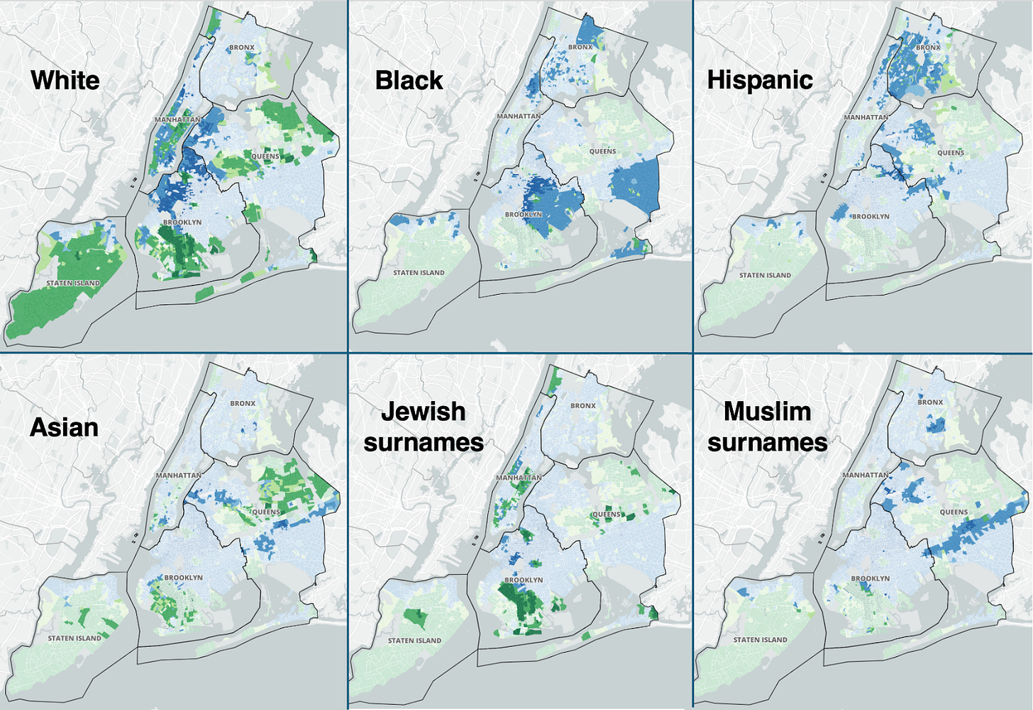 Start with the two boxes on the bottom right. Muslim communities went overwhelmingly for Mamdani. However, Cuomo won Jewish voters roughly 2:1. In New York in particular, many Jewish voters are fairly secular — still, Cuomo won everything from Hasidic Jewish communities to the more Jew-ish (hyphen intentional) and secular Upper East Side.